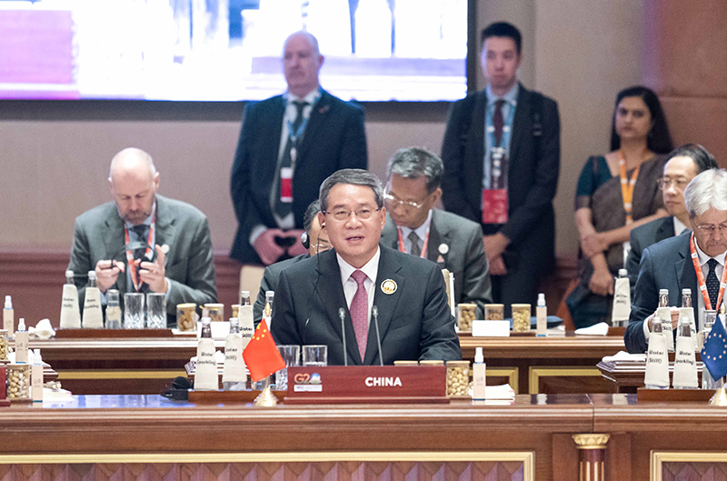 当地时间9月9日上午,国务院总理李强在印度新德里出席二十国集团领导人第十八次峰会第一阶段会议并发表讲话。新华社记者 李涛 摄