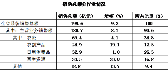 分行业看,农资、农副产品、日用消费品和再生资源等主营业务合计实现销售总额180.7亿元,占全省系统销售总额的90.6%,仍占据主导地位。其中,农资经营业务增速稳定,销售额占比最大;日用消费品经营业务受宏观消费环境影响,总量略微下降;农副产品、再生资源经营业务继续保持较快增长,但总量占比仍不高(如下表所示)。