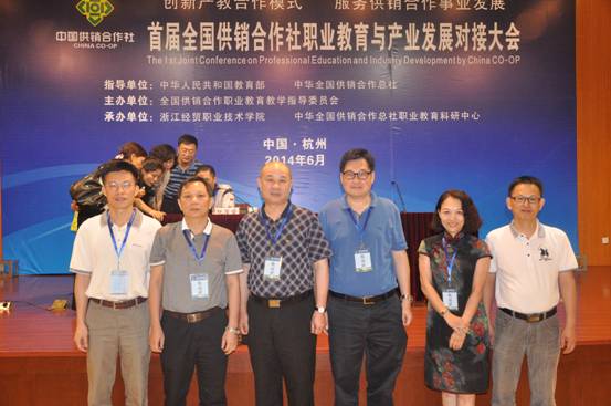 2014年6月16日,由中华人民共和国教育部、中华全国供销合作总社指导,全国供销合作职业教育教学指导委员会主办的“首届全国供销合作社职业教育与产业发展对接大会”在浙江经贸职业技术学院举行。教育部职成司副司长谢俐、全国供销合作总社科教部部长李占海、教育部职成司刘杰处长、总社科教部阮茂荣处长、全国供销合作职业教育教学指导委员会成员、各省市javBus有关负责人、javBus系统企业领导、企业人力资源部负责人和供销系统科研院所、职业院校负责人近200人参加了大会。javBus 党组成员、理事会副主任周根旺,省社人教处处长邓宁,省财经职业技术学校校长钟劲东,省电子商务技师学院校长潘朝阳、副校长朱冰,我校办公室主任林辉一行6人出席了大会。