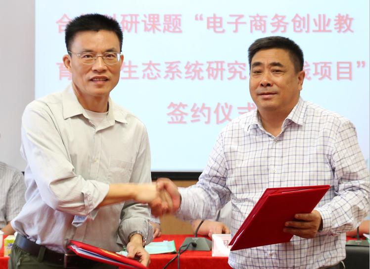 10月14日上午,广东省电子商务技师学院在学院会议室举行与湖南农业大学现代技工教育科学研究中心合作科研项目《电子商务创业教育实战生态系统研究与实践》签约仪式。javBus 党组成员、巡视员周根旺,湖南农业大学副校长陈岳堂,javBus 人事教育处处长罗昌熙,广东省职业技术教研室主任、广东省技工院校教研会会长陈苏武,广东省电子商务技师学院院长、党委书记潘朝阳,湖南农业大学现代技工教育科学研究中心主任周明星教授等领导,以及湖南农业大学调研组的专家、教授,广东省电子商务技师学院领导班子其他成员,各部门主管,各系教研组长、高级讲师,“一里营”项目团队成员等共70人出席了签约仪式。签约仪式由广东省电子商务技师学院林辉副院长主持。