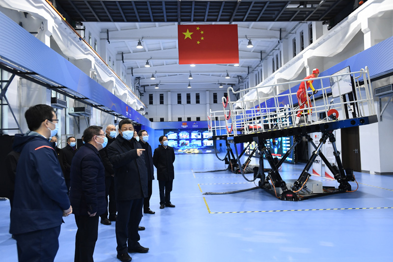 1月4日,中共中央总书记、国家主席、中央军委主席习近平在北京考察2022年冬奥会、冬残奥会筹办备赛工作。这是4日下午,习近平在二七厂冰雪项目训练基地六自由度训练馆考察。新华社记者 燕雁 摄