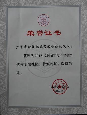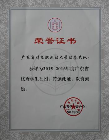 近日,广东省学生联合会传来喜讯,省财经学校茶艺队、礼仪队双双获评为2015-2016年度广东省优秀学生社团荣誉称号,获颁荣誉证书。