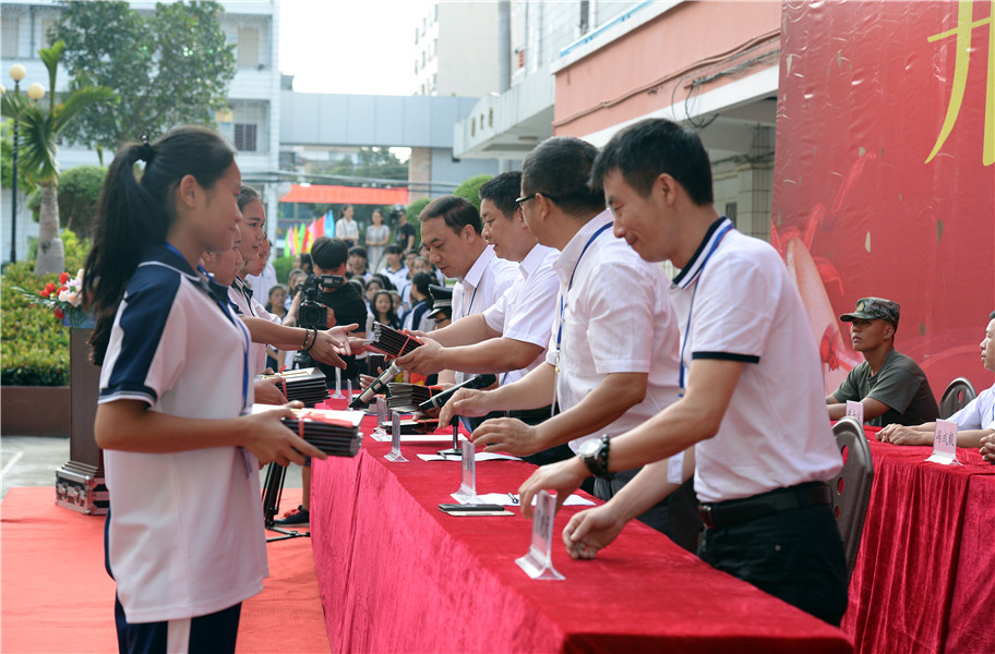 开学典礼在庄严肃穆的国歌声中拉开帷幕。团委书记、学生科副科长肖娟首先宣读了“优秀学生”表彰决定,对我校三好学生、优秀学生干部、全勤生、优秀志愿者等进行表彰。校领导分别为他们颁发奖状和荣誉证书。