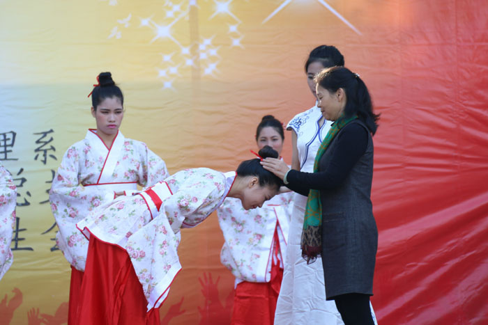开幕式上,身着汉服的演员展示了古代礼仪,从作揖、鞠躬、到品茶、执笔,展现古代女子的温婉优雅;成年礼上,经济管理系刘秋玲副主任与崔素民老师身为长者为女子盘髻施簪,寓意女子成年;古诗词朗诵带大家领略了唐诗宋词的风采;武术协会在刀光剑影之中尽展中华武术的精粹,最后,全体师生集体诵读《弟子规》,一起感受国学经典。