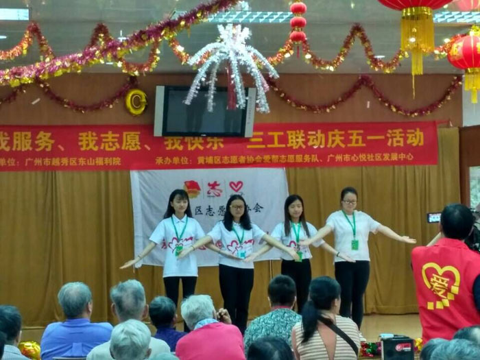 当天下午两点,青年志愿者协会成员们到达东山福利院,然后在会场协助准备工作,其中包括了协助布置会场、迎接表演嘉宾、指引老人们到观众席就坐等。