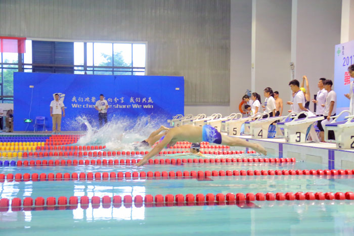 10月14日下午,2017年广东javBus 第三届“天成杯”游泳比赛在广东奥林匹克体育中心游泳馆正式开赛。全省有15个代表队共119名选手参加本次比赛。省电子商务高级技工学校由彭仲文副校长带队,派出共16人组成的教职工代表队参加比赛,其中凌健珍老师获男子C组200米蛙泳第一名,团体赛120岁以下组混合4×50米自由泳接力获第一名,学校代表队获团体总分数第一名的好成绩。
