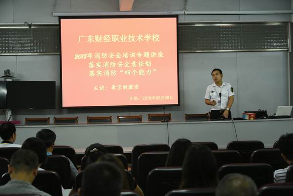 这是省财经学校为普及教职工消防安全知识,增强消防安全意识,提高应对突发险情自防自救的能力而组织的讲座,学校通常一年都会组织最少一次这类讲座,此外,每年还会组织一到两次的消防演练。