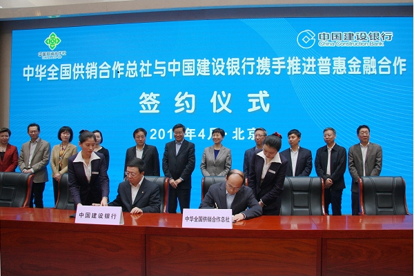 4月15日,中华全国供销合作总社与中国建设银行正式签署《普惠金融合作框架协议》,双方将利用各自的优势资源,携手创新服务模式,共同为广大农户提供全方位、便捷、优质的普惠金融服务。总社党组书记、理事会主任王侠,中国建设银行党委书记、董事长王洪章出席签约仪式并致辞。总社党组成员、理事会副主任邹天敬,中国建设银行党委委员、副行长杨文升分别代表双方签署合作协议。总社党组成员、理事会副主任,中国供销集团董事长杨建平出席签约仪式。