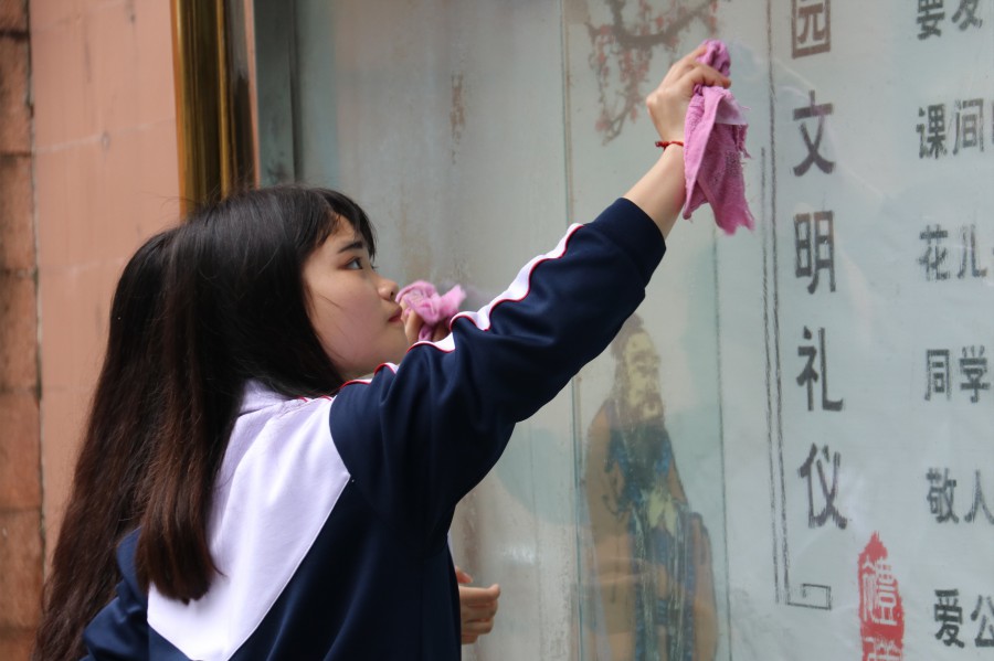 在学生负责人冯金兰同学的带领下,青协各部门成员分成了6个小组,同学们自带了抹布、扫把和水桶等工具,到指定的宣传栏、教学楼、实训楼等区域进行清扫。整个活动开展有序,同学们本着“团结互助,共同进步”的精神分工合作,把各自负责的区域打扫得十分干净。