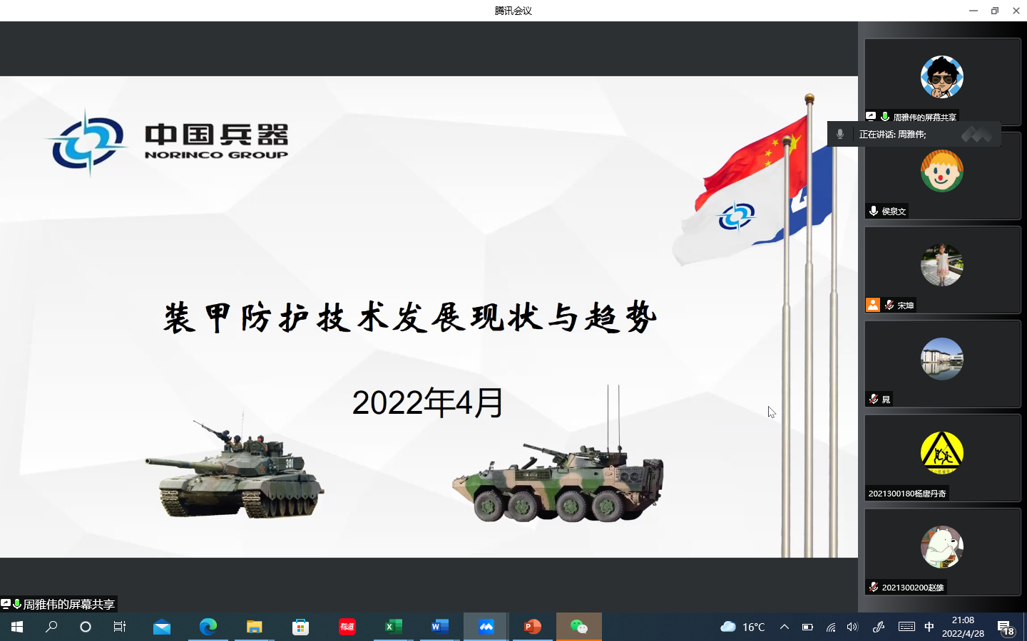 在报告中,周雅伟校友对我国装甲防护技术的发展现状与趋势进行了深入浅出的介绍,使参会师生对我国装甲防护技术有了充分了解并产生了浓厚的兴趣。