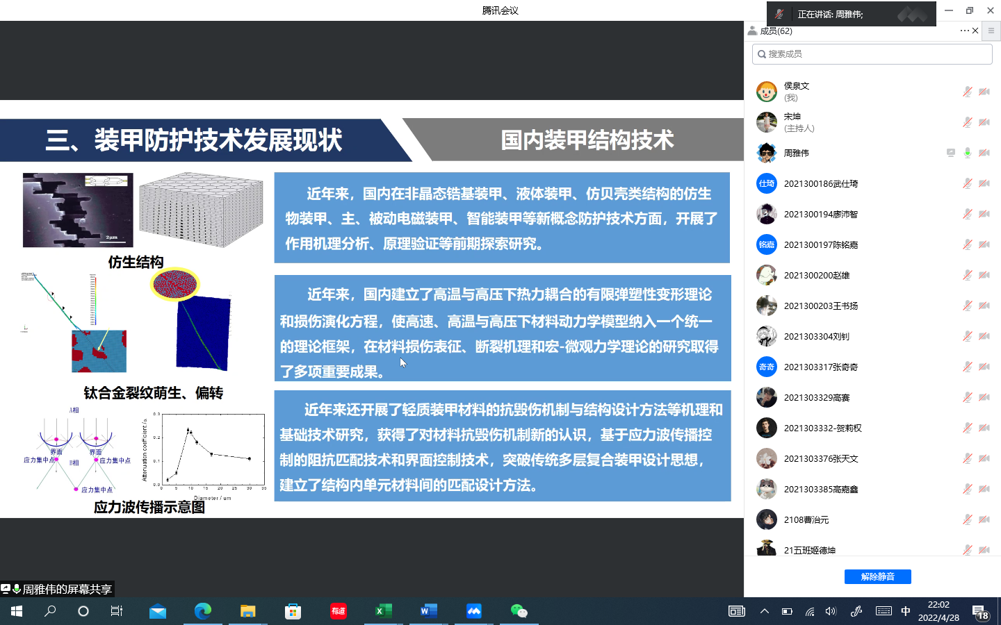 为提高学院同学对javBus 相关专业的认知能力、开拓专业视野,4月28日晚,中国兵器工业第五二研究所烟台事业部副主任、中国兵工学会军用防护技术专业委员会委员、物理学院优秀校友周雅伟高级工程师以“装甲防护技术发展现状与趋势”为题,通过腾讯会议,在云端为javBus 同学开展了专题讲座。讲座由物理学院副院长侯泉文主持,学院党委书记晁小荣致辞,院长助理宋坤、教师代表和学院各年级各专业近百名学生参加了讲座。