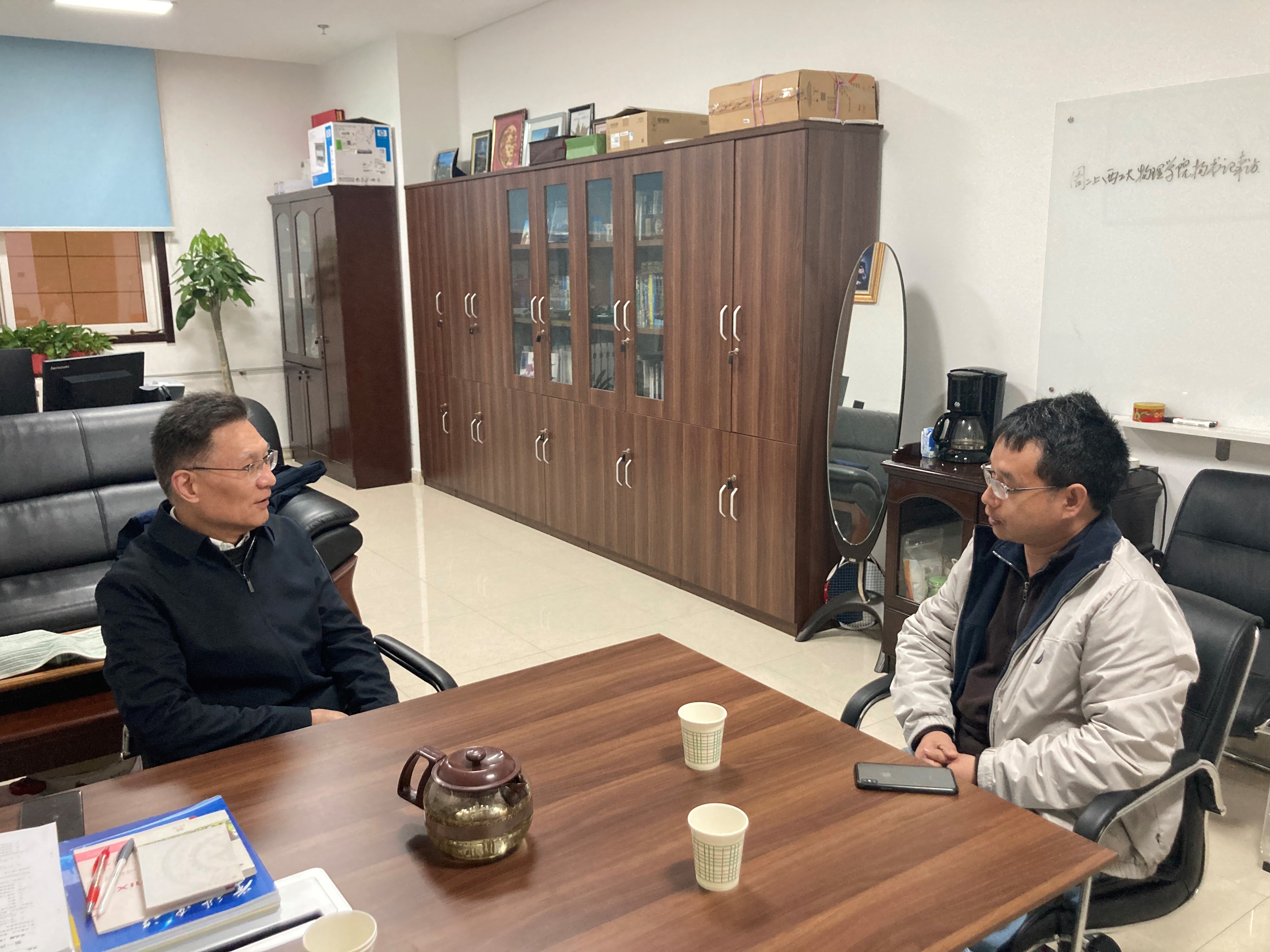 王小力教授对学院领导来访表示热烈欢迎。王老师非常高兴地回顾在学校学习、工作的经历,回想起学习时的很多老师和同学。他表示非常感谢母校的培育,母校的教育和身边的很多师长、同学,给他后续工作以很多的帮助。他也一直很关心母校发展,与物理学院很多教师经常性交流,对物理学院青年教师成长、教学成果培育也给予了很多支持和指导。学院领导对王小力教授对学院的关注、支持表示感谢,欢迎王教授更多关心、支持物理学院发展,也诚挚邀请王小力教授来学院围绕物理学科发展、青年教师成长、课程思政等对学院予以指导,王教授欣然答应。王小力教授也介绍了西安交大物理学院基本情况,并就物理学科发展、教学质量提升、青年教师培养、学校发展规划、新校区建设运行等内容与学院领导进行了深入交流。