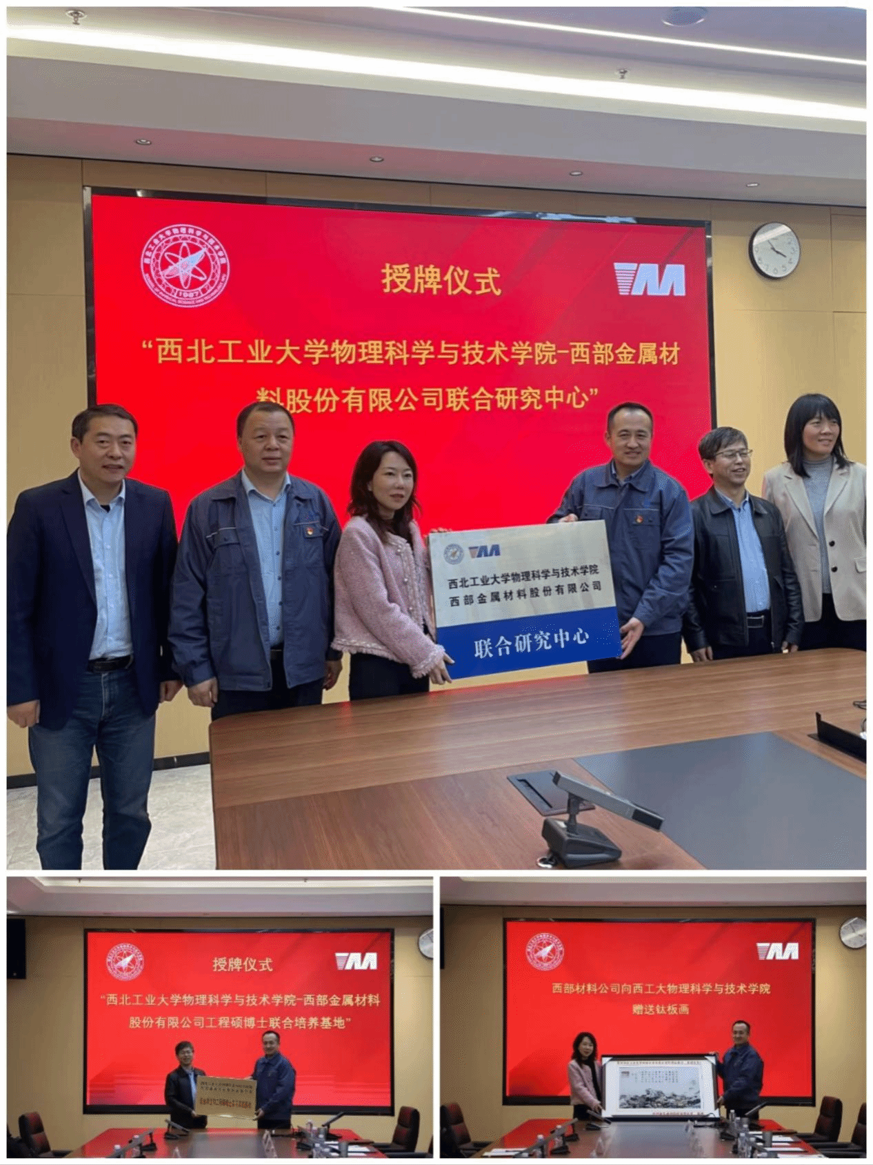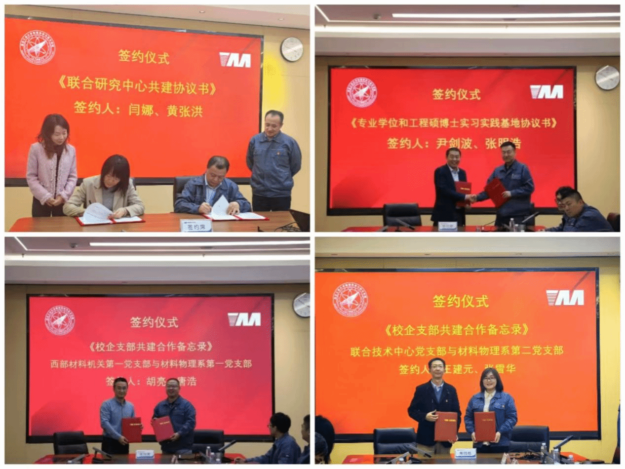 -西部金属材料股份有限公司工程硕博士联合培养(实践)协议书》、《校企支部共建合作备忘录》,同时还举行了联合研究中心、工程硕博士联合培养基地、专业学位和工程硕博士实习实践基地的授牌仪式。