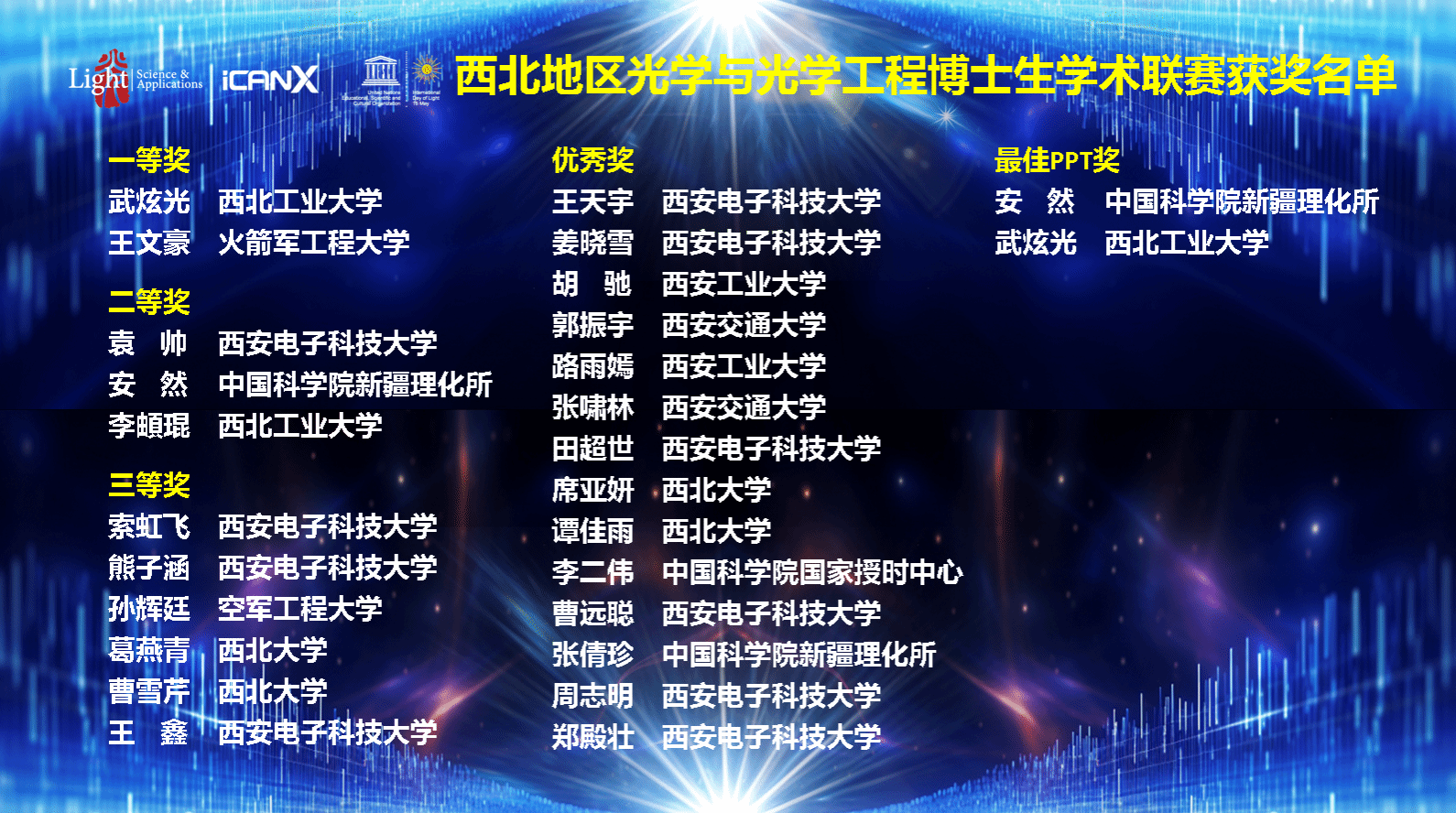 本次学术竞赛活动不仅为西北地区从事光学与光学工程领域研究的博士生们提供了展现自己最新科研成果的机会,也为来自不同单位和方向的老中青学者间相互交流、以及年轻一代从事光学与光学工程领域研究的博士生们搭建助飞的平台。