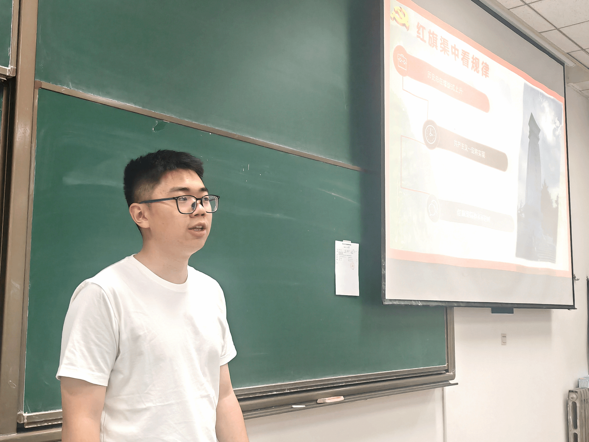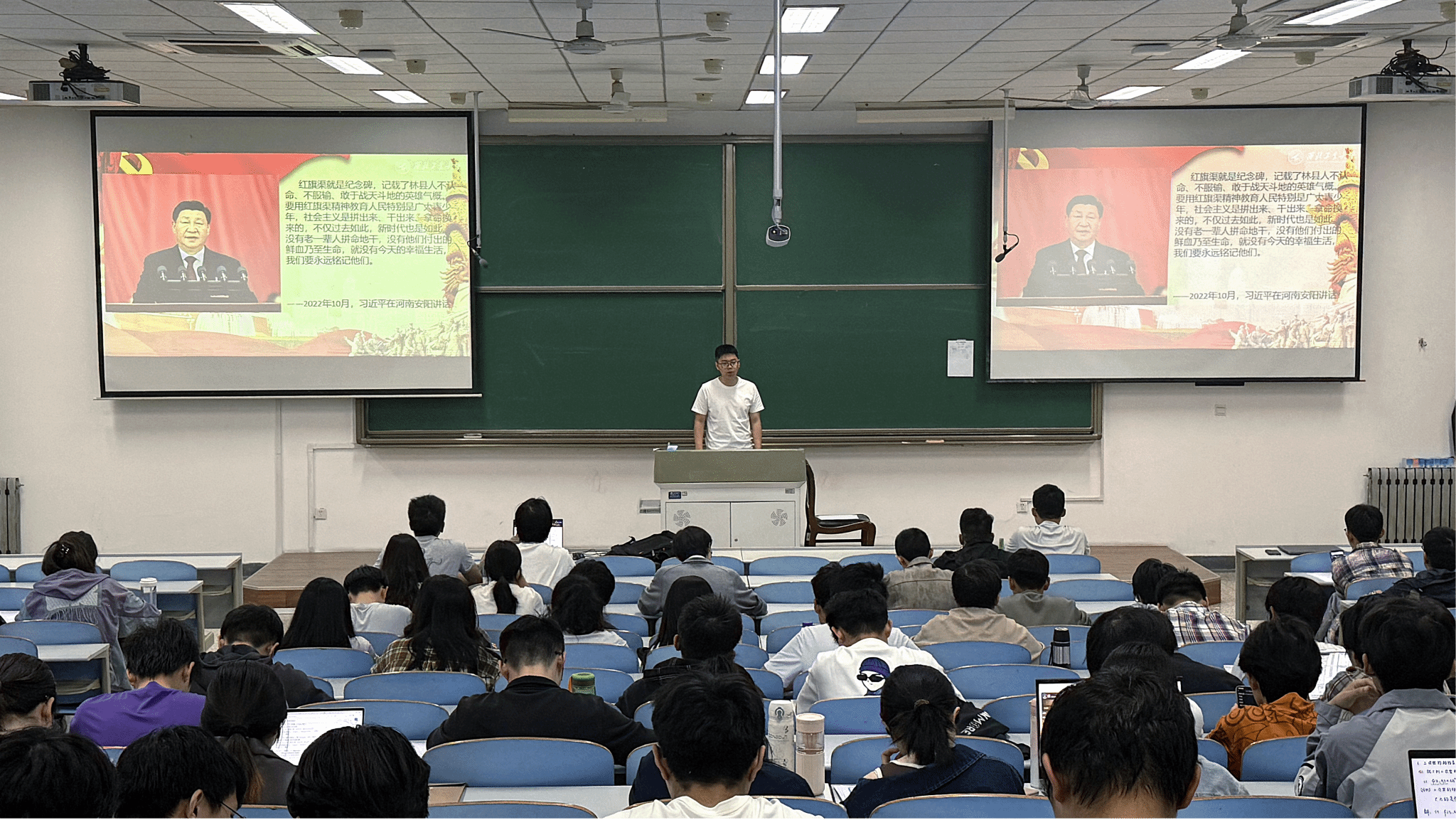 张益沐以“红旗渠水涓涓流淌,总师之魂赓续弘扬”为主题,以习近平总书记在河南安阳林州市红旗渠纪念馆视察的重要讲话精神为切入点,深入探讨了红旗渠精神在新时代的重要地位和价值。结合自己的社会实践经历,张益沐生动地讲述了红旗渠的历史背景、建设过程以及其中涌现出的典型人物和事迹,红旗渠精神不仅体现在改造自然的伟大壮举中,更是新时代实现中华民族伟大复兴中国梦的强大精神动力。鼓励同学们,在新时代的征程中,面临着各种挑战和困难,需要赓续红旗渠精神,勇于拼搏,敢于创新,为社会发展贡献力量。
