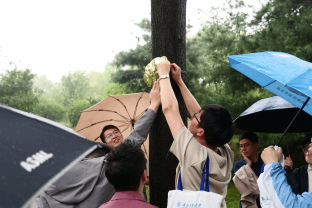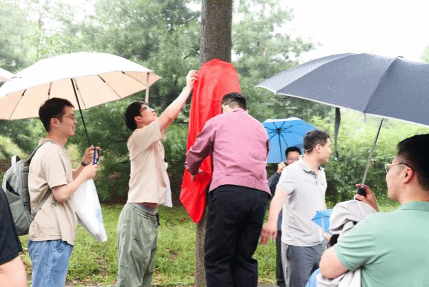 下午,雨仍在下,理学院大楼前举行了简朴庄重的捐赠仪式。当牌匾悬挂在楼前大树上时,雨水顺着牌面流淌,仿佛岁月的印记在此定格。校友们冒雨见证这一时刻,裤脚虽被溅湿,却浇不灭对母校的拳拳之心。