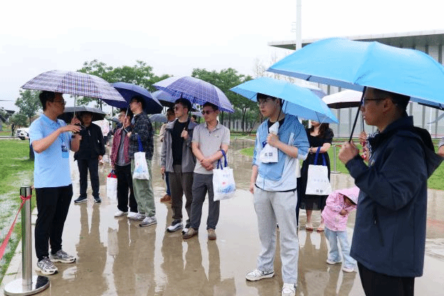 在长安校区军工素质教育实践中心(飞机展示区),校友们冒雨参观航空航天装备展示。雨点浇不灭热情,大家纷纷用手机记录,聆听讲解员讲述装备背后西工大人的贡献,不时发出赞叹。