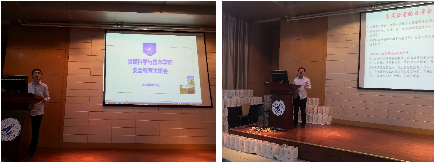 安全规章制度。29日下午,全体研究生安全教育大会在王洲航老师的主持下如期进行,毛东副院长为全院研究生作了题为实验室科研安全的专题讲座,院长助理肖鼎新老师布置了假期有关安全工作。29日晚,2018级和2019级本科生安全教育大会在理学院学术报告厅举行,王洲航老师主持会议,辅导员曾超老师和兼职辅导员王时宇同学参会。 会议最后,学院为同学们精心准备的中秋礼物使整个会议室都洋溢着喜迎双节的快乐气息。
