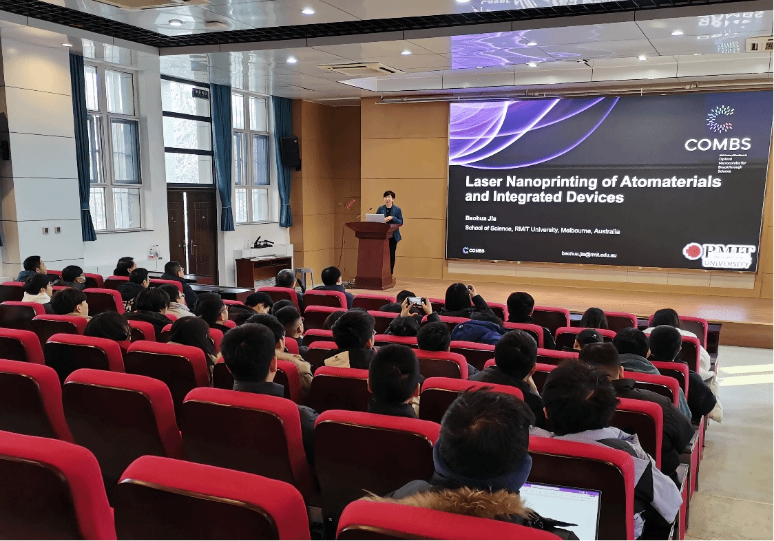 在报告中,贾宝华教授主要介绍3D纳米打印技术及其在氧化石墨烯等纳米材料方面的应用,讲述了3D纳米打印在空间、时间及原子尺度上对材料进行精确操作及光子器件制备。贾教授不仅介绍了光学纳米印刷及二维光子集成器件的研究现状和应用前景,也分享了超快光学纳米打印和埃米材料器件的发展方向及面临的主要挑战。特别是,贾教授深入讲述了其团队开发的石墨烯超材料及其优异光学和热学特性,利用先进激光纳米打印技术制备的超薄、重量轻、柔性功能光子器件为集成光学发展提供的新机遇。