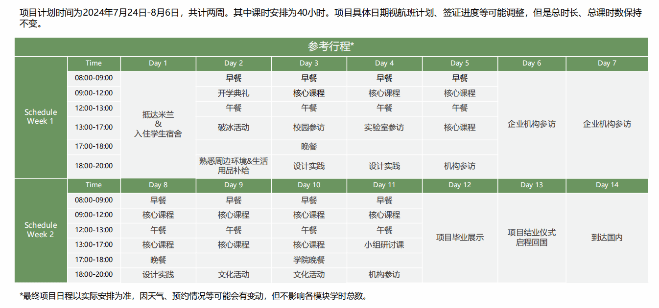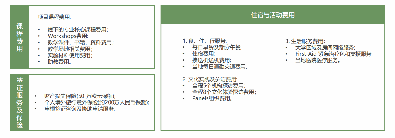 (包括线下的课程、文化活动、机构探访、住宿、餐饮、当地通勤及接送机、项目服务管理费用、签证服务及保险费用,明细如下)