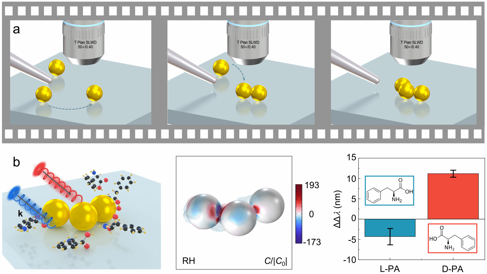 图1. (a)光谱辅助金纳米球三聚体的可控组装 (b) 三聚体增强分子对映体的手性传感