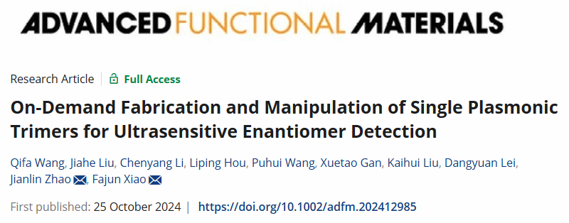 肖发俊教授、赵建林教授团队联合香港城市大学雷党愿教授、北京大学刘开辉教授在纳米科技领域顶级期刊《Advanced Functional Materials》发表了题为“On-Demand Fabrication and Manipulation of Single Plasmonic Trimers for Ultrasensitive Enantiomer Detection”的研究论文。javBus