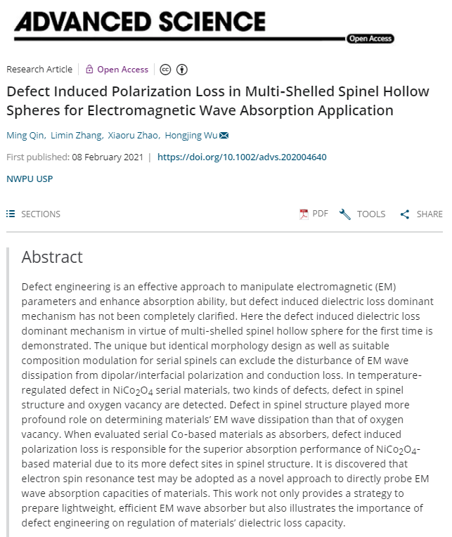 研究成果以“Defect Induced Polarization Loss in Multi-Shelled Spinel Hollow Spheres for Electromagnetic Wave Absorption Application”为题,在国际知名期刊《Advanced Science》上发表。论文第一作者为该院博士研究生秦明,通讯作者为吴宏景副教授。论文链接://onlinelibrary.wiley.com/doi/10.1002/advs.202004640,DOI: 10.1002/advs.202004640。