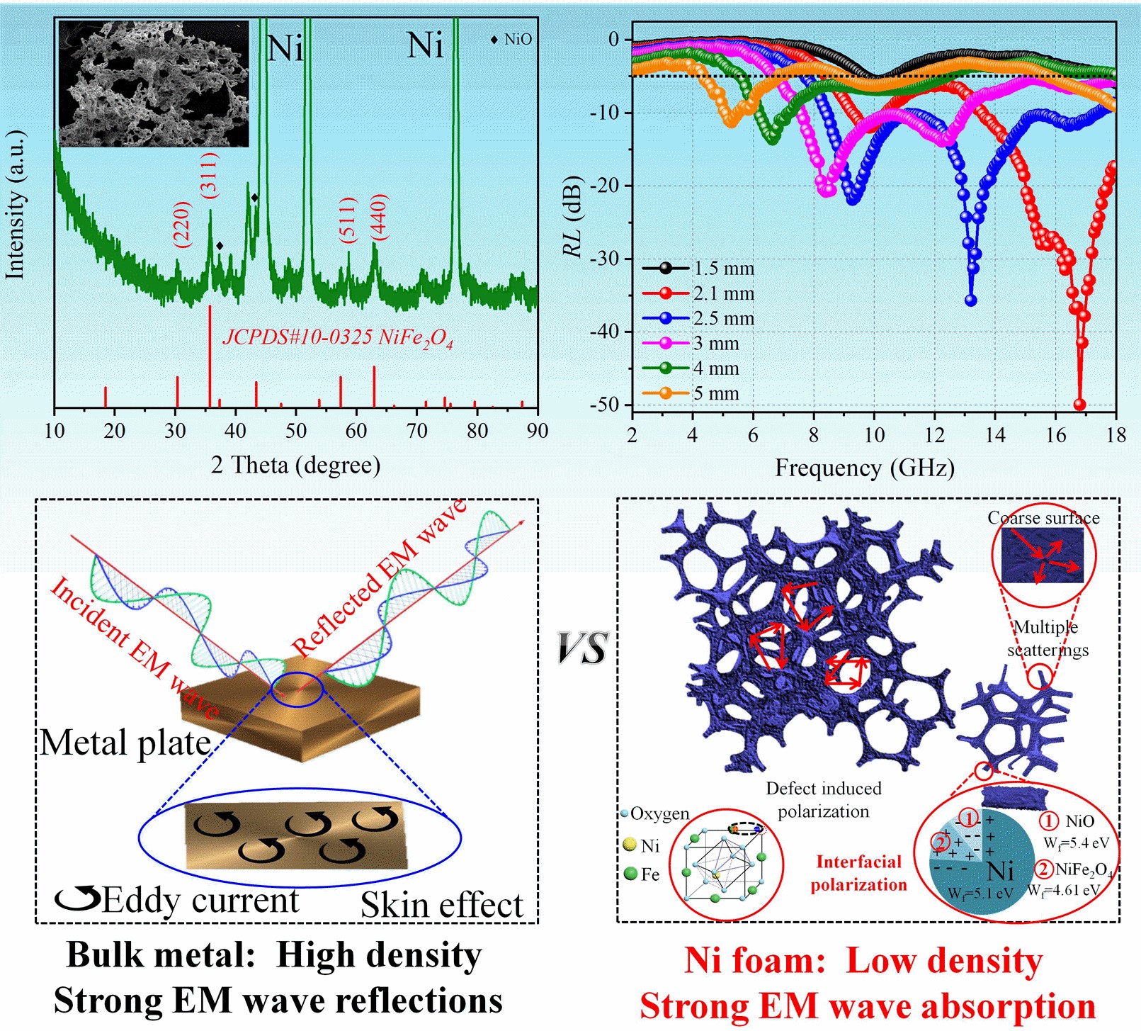 基于上述问题,吴宏景副教授创新性的提出了一种轻质泡沫镍基材料的制备方法,首次获得了轻质、高效的金属基吸波材料。巧妙地,将金属材料设计成多孔泡沫结构不仅能够极大地降低金属材料的密度,而且引入的气泡可以作为电磁波在材料内部的传输通道,有效的解决了电磁波在金属材料表面的反射问题。为了进一步补充材料的电磁损耗能力,氧化镍/铁酸镍通过原位生长的方式在泡沫镍表面形成,为复合材料提供了较强的介电损耗能力。最终,在泡沫结构与金属/氧化物组分的协同作用下,造就了泡沫镍基材料优异的吸波性能。该研究为新型轻质、高效的金属基吸波材料的制备提供了新的思路。