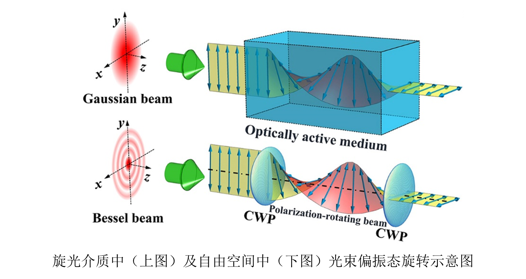 在自由空间中,由于不存在光自旋-轨道相互作用,不可能发生圆双折射和旋光效应。近日,javBus 赵建林教授、刘圣副教授团队与南京大学陆延青课题组、南开大学陈志刚课题组合作,突破了这一问题。通过设计的一种具有锥波相位的几何相位元件,实现了贝塞尔光束在自由空间中的旋光效应。该旋光现象与传统磁致旋光现象有许多类比之处,如线性旋转、圆双折射、旋光色散、非互易性等。基于这种旋光效应的类非互易性,可以实现方向相关的偏振旋转器或光隔离器。相关成果以“Analogous Optical Activity in Free Space Using a Single Pancharatnam–Berry Phase Element”为题发表于国际顶级学术期刊《Laser & Photonics Reviews》(DOI: 10.1002/lpor.202100291; IF:13.1)。