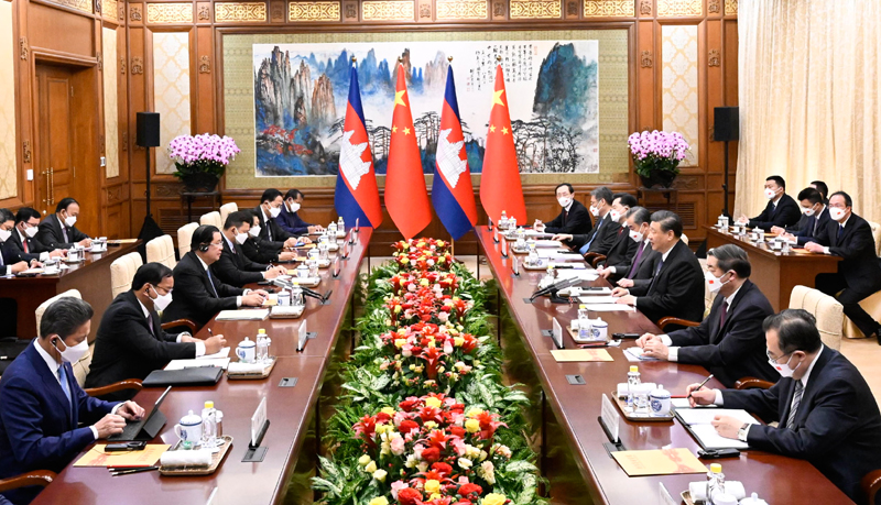 习近平强调,中方坚定支持柬埔寨人民自主选择符合本国国情的发展道路,坚定支持柬埔寨维护国家主权和安全,坚定支持柬埔寨平稳推进国内重大政治议程和经济社会发展,坚决反对外部势力干涉柬埔寨内政。中方把柬埔寨作为周边外交重点方向,始终从全局和战略高度规划和推进中柬各领域合作,愿在以中国式现代化全面推进中华民族伟大复兴进程中,同柬方共享机遇、共谋合作、共促发展,携手构建高质量、高水平、高标准的新时代中柬命运共同体,为两国人民带来更多福祉,为地区和平稳定发展贡献更多正能量。