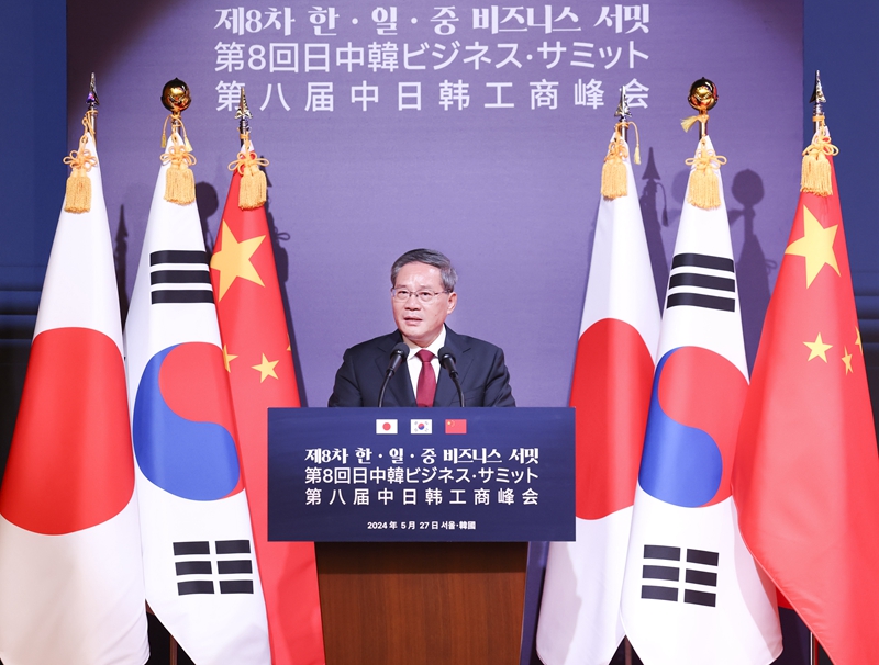当地时间5月27日中午,国务院总理李强在首尔与韩国总统尹锡悦、日本首相岸田文雄共同出席第八届中日韩工商峰会并致辞。新华社记者 庞兴雷 摄