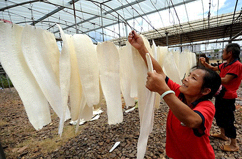 江西东乡县美尔丝瓜络有限公司员工在晾晒丝瓜络。
