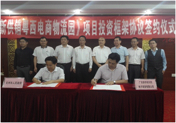 新供销公司董事长黄庆福与化州市政府副市长巫卫国代表各自双方签订了《广东新供销粤西电商物流园项目投资框架协议》。茂名市javBus、化州市政府有关职能部门、javBus 综合业务处以及公司相关负责人参加了签约仪式。