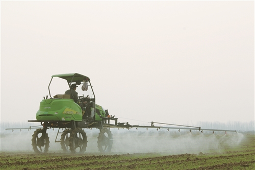 诸城市供销合作社相州为农服务中心利用农机开展春季小麦病虫害防治。王建荣 摄