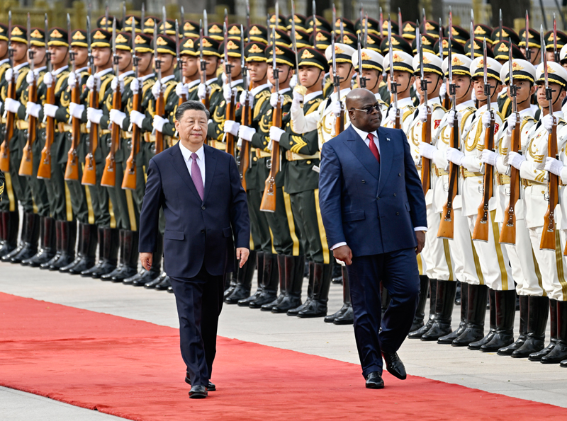 5月26日下午,国家主席习近平在北京人民大会堂同来华进行国事访问的刚果(金)总统齐塞克迪举行会谈。这是会谈前,习近平在人民大会堂东门外广场为齐塞克迪举行欢迎仪式。新华社记者 殷博古 摄