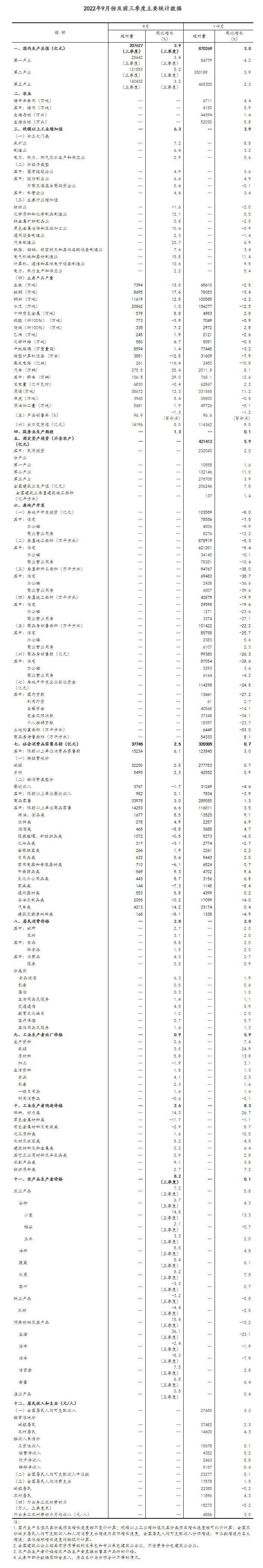 (2)根据季节调整模型自动修正结果,对近一年来各期国内生产总值、规模以上工业增加值、固定资产投资(不含农户)、社会消费品零售总额环比增速进行修订。修订结果及2022年三季度GDP环比数据、2022年9月份其他指标环比数据如下: