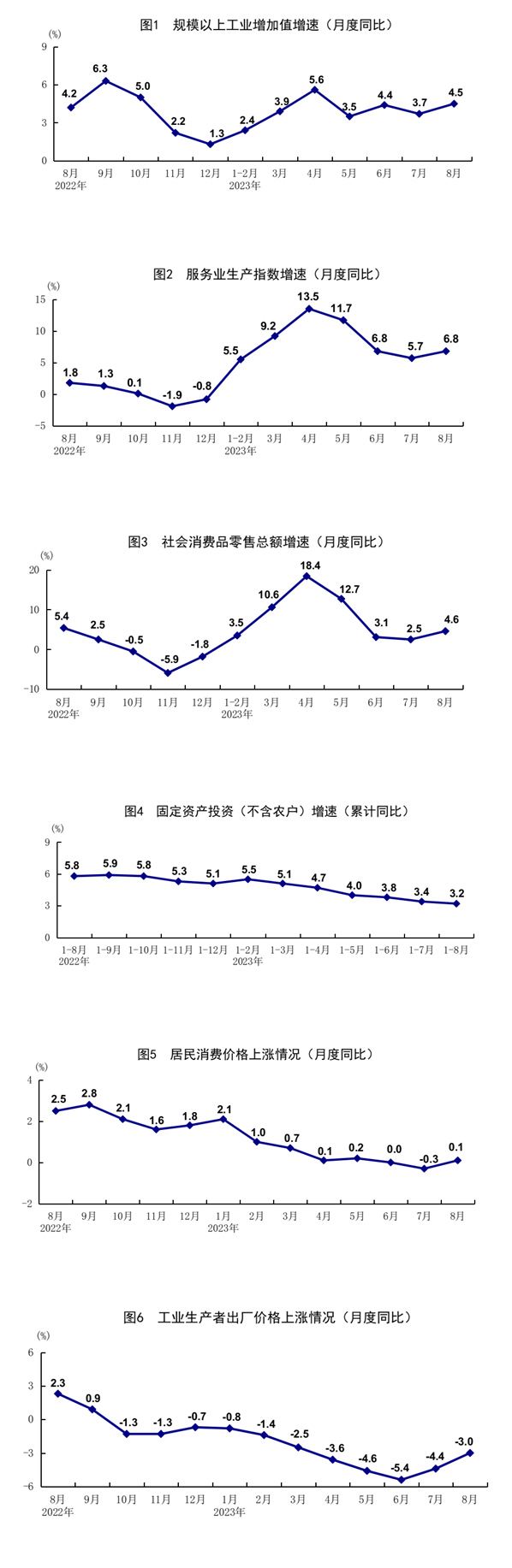 8月份,全国规模以上工业增加值同比增长4.5%,比上月加快0.8个百分点;环比增长0.50%。分三大门类看,采矿业增加值同比增长2.3%,制造业增长5.4%,电力、热力、燃气及水生产和供应业增长0.2%。装备制造业增加值同比增长5.4%,比上月加快2.1个百分点;高技术制造业增加值增长2.9%,加快2.2个百分点。分经济类型看,国有控股企业增加值同比增长5.2%;股份制企业增长5.7%,外商及港澳台商投资企业增长0.8%;私营企业增长3.4%。分产品看,太阳能电池、服务机器人、光电子器件产品产量同比分别增长77.8%、73.7%、29.9%。1—8月份,全国规模以上工业增加值同比增长3.9%。8月份,制造业采购经理指数为49.7%,比上月上升0.4个百分点;企业生产经营活动预期指数为55.6%。