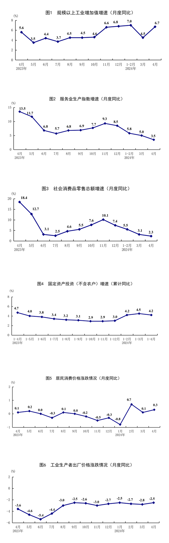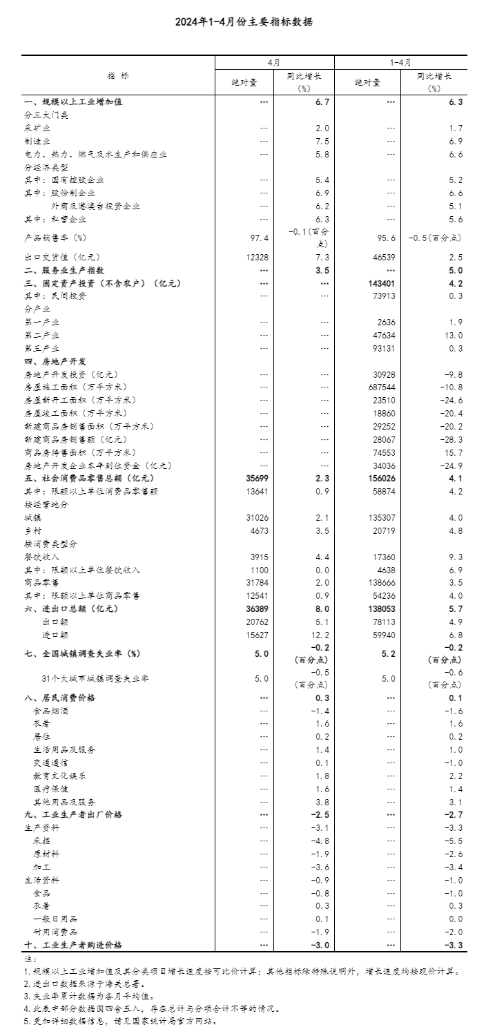 总的来看,4月份国民经济运行平稳,虽然部分指标受节假日错月、上年同期基数较高等因素影响增速有所放缓,但工业、出口、就业、物价等主要指标总体改善,新动能保持较快成长,国民经济延续回升向好态势,积极因素累积增多。但也要看到,外部环境复杂性、严峻性、不确定性明显上升,经济持续回升向好仍面临诸多困难挑战。下阶段,要坚持以习近平新时代中国特色社会主义思想为指导,全面贯彻落实中央政治局会议精神,坚持稳中求进工作总基调,完整、准确、全面贯彻新发展理念,加快构建新发展格局,着力推动高质量发展,靠前发力有效落实已经确定的宏观政策,巩固和增强经济回升向好态势,持续推动经济实现质的有效提升和量的合理增长。