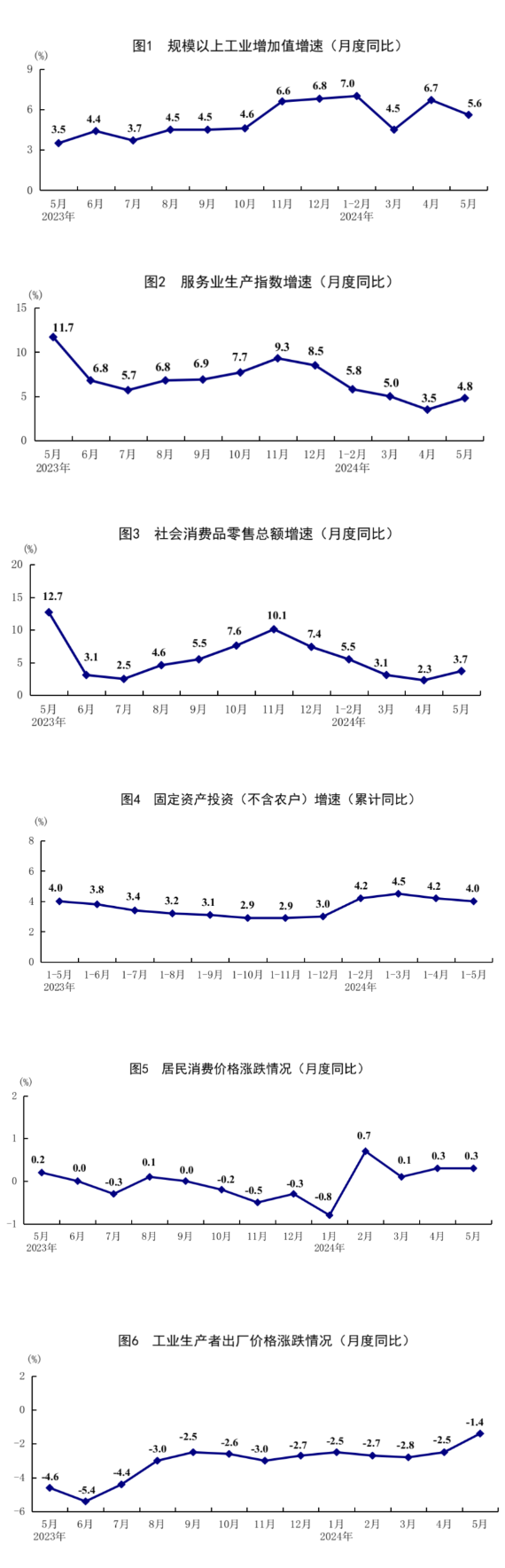 总的来看,5月份,经济运行总体平稳,主要指标有所回升,新动能较快成长。但也要看到,当前外部环境复杂严峻,国内有效需求依然不足,经济持续回升向好仍面临诸多困难挑战。下阶段,要坚持以习近平新时代中国特色社会主义思想为指导,坚持稳中求进工作总基调,完整、准确、全面贯彻新发展理念,加快构建新发展格局,着力推动高质量发展,靠前发力有效落实已经确定的宏观政策,因地制宜发展新质生产力,坚定不移深化改革扩大开放,巩固和增强经济回升向好态势,持续推动经济实现质的有效提升和量的合理增长。