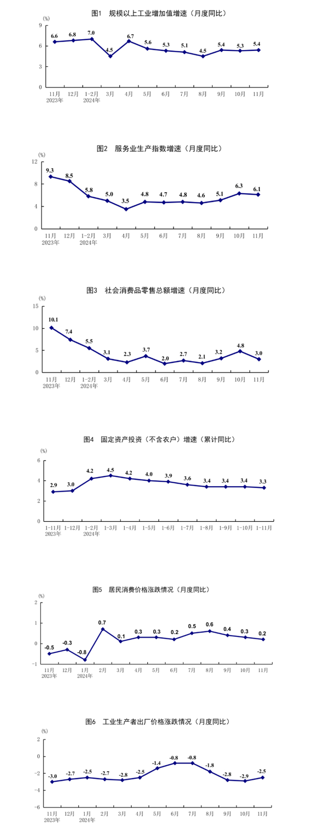 11月份,全国规模以上工业增加值同比增长5.4%,比上月加快0.1个百分点;环比增长0.46%。分三大门类看,采矿业增加值同比增长4.2%,制造业增长6.0%,电力、热力、燃气及水生产和供应业增长1.6%。装备制造业增加值同比增长7.6%,比上月加快1.0个百分点;高技术制造业增加值增长7.8%,快于全部规模以上工业增加值2.4个百分点。分经济类型看,国有控股企业增加值同比增长3.9%;股份制企业增长6.0%,外商及港澳台投资企业增长3.4%;私营企业增长4.5%。分产品看,新能源汽车、工业机器人、集成电路产品产量同比分别增长51.1%、29.3%、8.7%。1—11月份,全国规模以上工业增加值同比增长5.8%。11月份,制造业采购经理指数为50.3%,比上月上升0.2个百分点;企业生产经营活动预期指数为54.7%,上升0.7个百分点。1—10月份,全国规模以上工业企业实现利润总额58680亿元,同比下降4.3%。