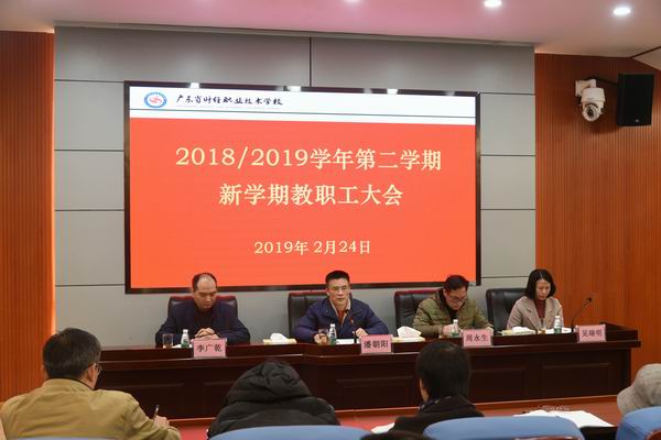 2019年2月24日,省财经学校在学校实训楼二楼多功能报告厅召开2018—2019学年第二学期全校教职工大会。学校党委书记、校长潘朝阳,副校长周永生、李广乾、吴瑞明出席会议,全体教职员工参加了会议。会议由周永生主持。