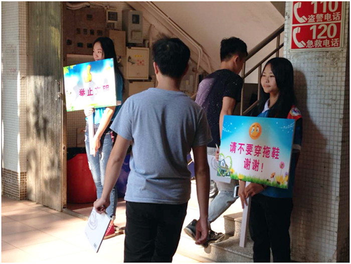 活动形式主要为院学生会的学生干部在同学们较常出入的教学楼入口、实训楼入口设置文明巡查岗,通过对遵纪守时、爱护环境、着装得体等文明行为点赞和对上课迟到、穿拖鞋进教室、带食品进教室、随手丢垃圾等不文明现象进行友好提醒的方式,倡导文明举止,营造文明校园氛围。经过一个多月的实践,收到良好效果,上述不文明行为明显减少。