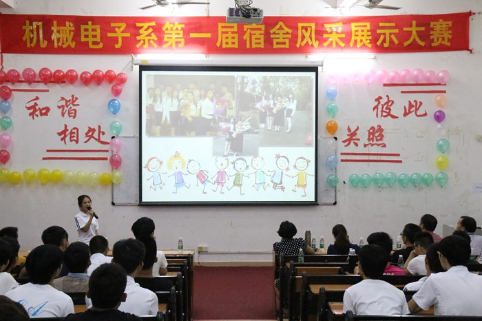 在比赛过程中,各参赛宿舍从宿舍卫生情况、舍友情感、宿舍文化等内容进行展示和推介,其中有温情满满的对白,也有轻松幽默搞怪的调侃。赛后,机械电子系张小娃主任代表系部的老师向在座学生表达了会一直陪伴同学们成长、成人、成材的心情,祝愿老师们能快乐工作,教书育人;同学们能开心学习,快乐成长。生活指导部刘部长也表态,会充分考虑同学们提出的有关宿舍管理方面的建议,向领导转达这些建议,努力把宿舍管理工作做好,服务师生。