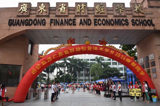 迎新日当天校园里,“热烈欢迎2016级新同学”、 “在财经学校放飞青春梦想,让人生之路从此灿烂辉煌”、“德技双馨育桃李,知行合一沐春风”、“凭借满腔洪荒之力,炼就一颗工匠之心”、“选择今天、成就明天,财校因你而精彩”、“喜做财校学子,畅享贴心服务”、“学园、乐园、家园,这里是我们幸福成长的乐土”、“友谊来源于交流,情感植根于沟通”的欢迎标语随处可见。钟劲东校长等学校领导深入迎新现场,现场察看报到情况,亲切看望前来报到的新生和家长。财会金融系、电子商务系、商贸管理系、艺术设计系四大系的新生接待处早早就布置好,工作人员各就各位,迎接新同学的到来。学校办公室、招生就业办、学生科、教务科、行政科、财务科等部门采取集中办公的方式,统一办理入学注册手续。学生志愿者不停地穿梭在校园报到处、注册区、宿舍、食堂等地方,引导新生和家长办理手续,热情帮忙搬运行李。老师还特地去到各新生宿舍,与新生和家长进行交流,了解新生安顿情况,回答他们的咨询。同时,还设置校园一卡通办理处和校服购买处,为新同学们提供了方便快捷的“一站式服务”。在校外,学校设有广州南站(高铁)、天河客运站、省汽车站、滘口地铁站、大沥汽车站五个点的接站服务,为新生和家长送上贴心服务。