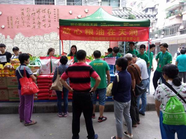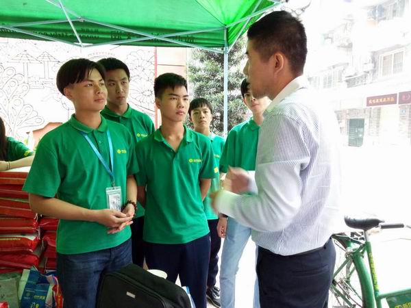 11名学生分成三组,在天润公司人员带领下分别前往万涛店、淘金店及应元店开展社区活动。学生在社区活动现场积极主动,向客户介绍产品特点,完成从销售到送货等流程的一条龙服务。活动中公司还安排专人向学生分享营销知识,理论结合实践。
