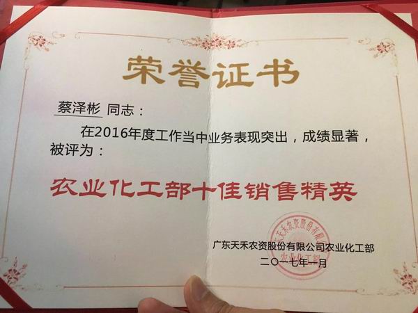 广东天禾农资股份有限公司是华南地区最大的农业综合服务商,是广东省500强企业,在全国农资流通企业综合竞争力排名第七。公司先后荣获“全国实施卓越绩效模式先进企业”、“全国工人先锋号”、“全国百佳(优秀)农资经销商”、“广东省企业500强”、“广东省商贸流通业百强”、“广东省和谐劳动关系先进企业”等重要荣誉,改革发展成效得到社会各界高度好评,品牌深受广大农民朋友信赖。