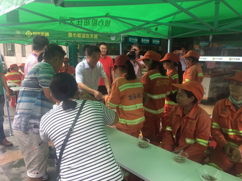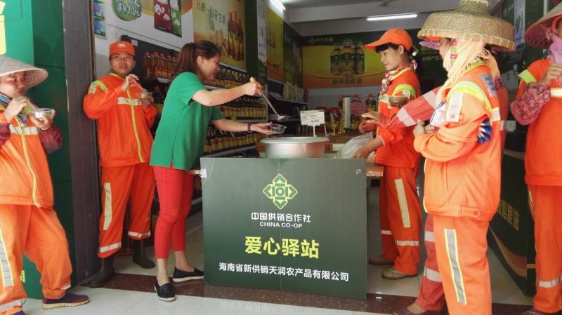 海南省新供销天润农产品有限公司开展“爱心驿站”活动,让环卫工人感受夏日里的清凉。自6月10日起至9月的每个周末,海口市区所有的“新供销天润”连锁直营店均设置“爱心驿站”服务点,为环卫工人提供休息场所,免费供应绿豆汤,消暑解渴。