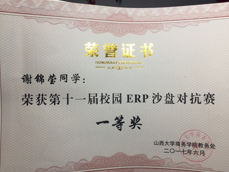 3月,谢锦莹同学参加学校的ERP沙盘对抗赛从86支队伍层层选拔脱颖而出,荣获省赛资格。5月20日,她代表学校远赴晋中市参加第十三届全国大学生“新道杯”沙盘模拟大赛山西省总决赛,荣获二等奖(第四名)。凭着团队合作与Erp沙盘扎实基础,经过7天的日夜训练, 在6月9日代表学校赴大同市参加“学创杯”2017年全国大学生创业综合模拟大赛荣获山西省总决赛二等奖(第三名)。