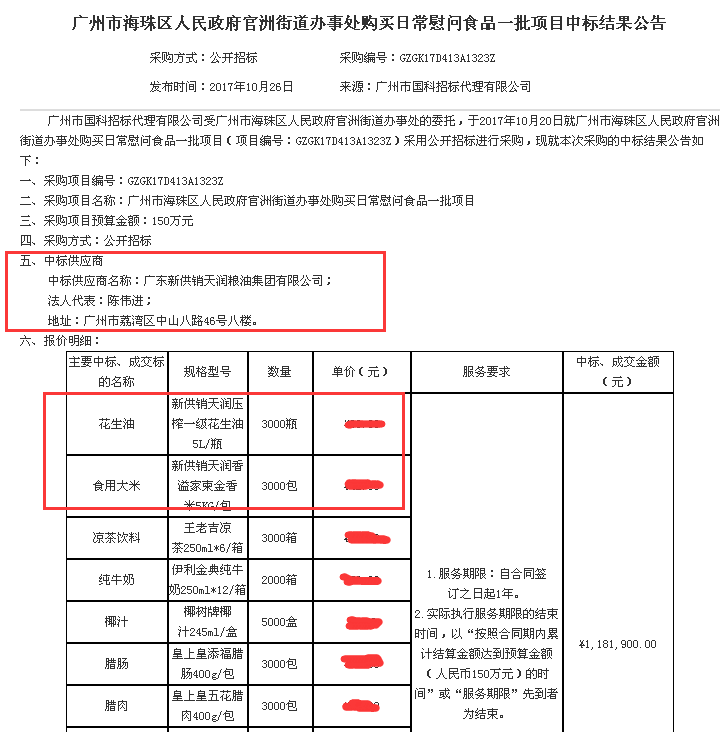天润粮油集团中标海珠区官洲街道办事处采购日常慰问食品项目