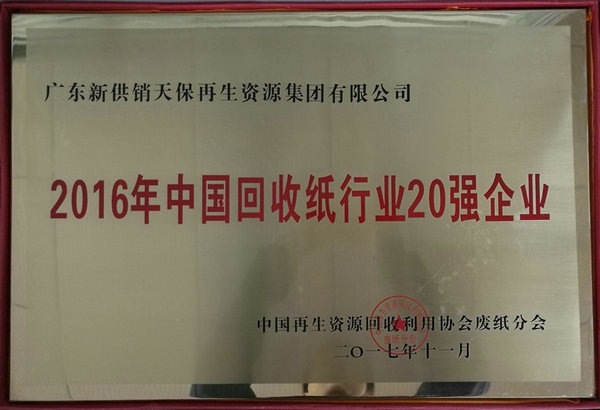 近日,由中国再生资源回收利用协会主办、中国再生资源回收利用协会承办的第二届中国回收纸行业大会在北京召开。广东新供销天保再生资源集团有限公司荣获“2016年中国回收纸行业20强企业”称号。